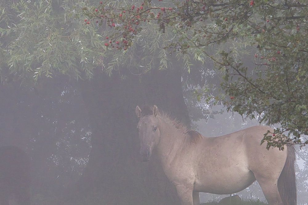 Deux chevaux (chevaux Konik) dans la brume près de la Chambre bleue à Rhenen. Cela crée une belle silhouette des deux chevaux.