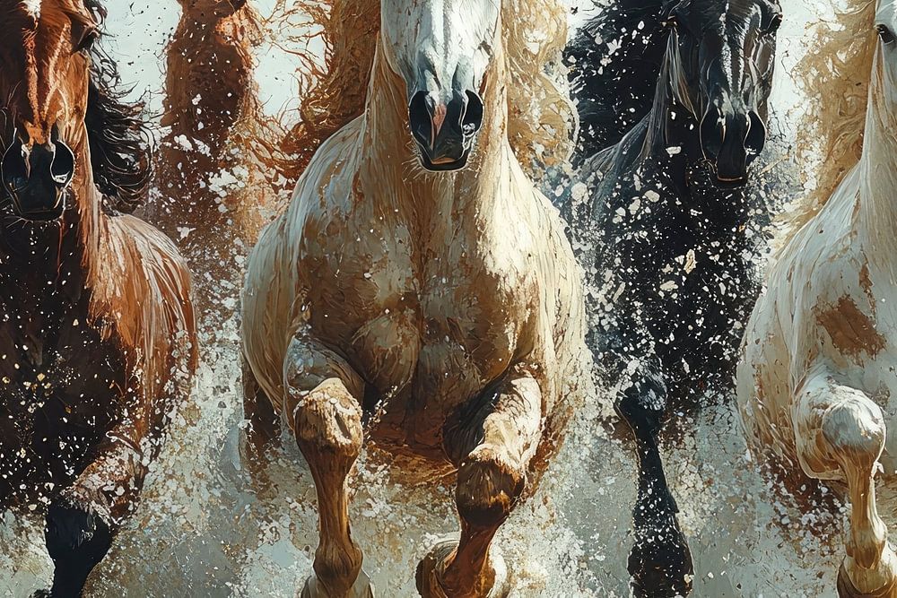 Une scène époustouflante de chevaux courant librement le long du rivage, leurs foulées puissantes éclaboussant les vagues sous la lueur d'un ciel radieux. Cette œuvre d'art capture l'essence de la beauté sauvage de la nature et l'esprit de liberté, ce qui en fait un complément parfait à toute collection d'art ou décoration d'intérieur. Idéal pour les amateurs d'équitation et les amoureux de la nature.