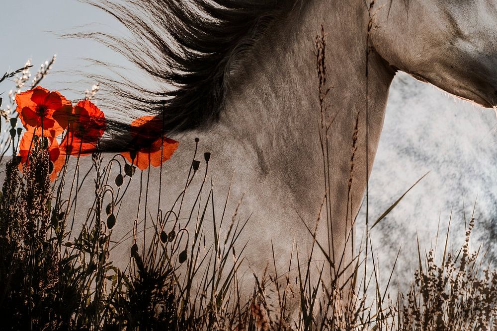 Deux élégants chevaux apparaissent dans une composition stratifiée de lumière, d'herbe et de coquelicots en fleurs. Leurs silhouettes sont éclairées par le soleil bas, tandis que les fleurs rouges sont un accent vif sur les tons doux de leurs robes. L'étalon de tête respire la force et la vivacité, sa crinière battante soulignant le mouvement. La combinaison de la beauté naturelle et de la liberté symbolique fait de cette œuvre une ode à la vie, aux saisons et au lien entre l'animal et le paysage.
