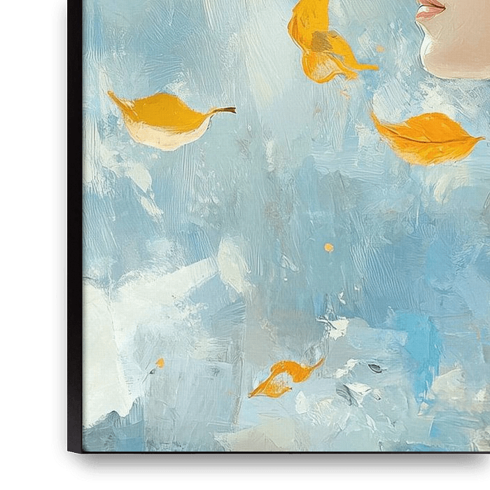 Cheveux orange - Cette peinture de femme montre une jeune femme aux beaux cheveux orange, entourée de feuilles dorées flottant dans l'air, sur un fond calme et bleuté.