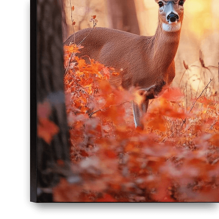 Au milieu d'une mer de feuilles dorées, un doux chevreuil regarde avec curiosité, entouré de tons chauds d'automne. Ce lien harmonieux avec la nature apporte calme et sérénité dans chaque pièce. Parfaitement adapté au salon, ce tableau confère une atmosphère accueillante et invite à profiter de la beauté de la nature.