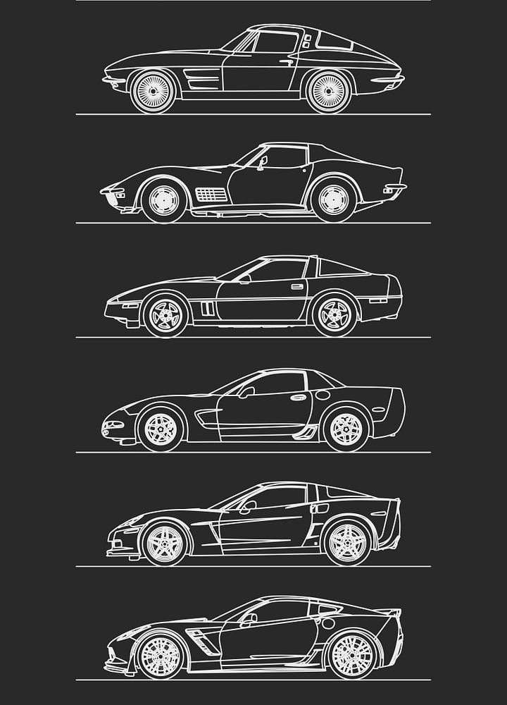 Acheter ce illustration Chevrolet Corvette Evolution par Artlines Design sur toile, aluminium, ArtFrame ou photographie (encadrée), impression d'art en haute qualité et tout format.