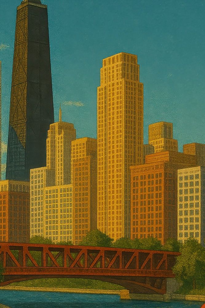 Une vue sur l'impressionnante ligne d'horizon de Chicago, où les gratte-ciel s'élèvent vers le ciel et où règne une atmosphère détendue au bord de l'eau. La scène dégage un esprit d'aventure et de curiosité, idéal pour le salon afin d'encourager les conversations et d'apporter la beauté de la vie urbaine à la maison.