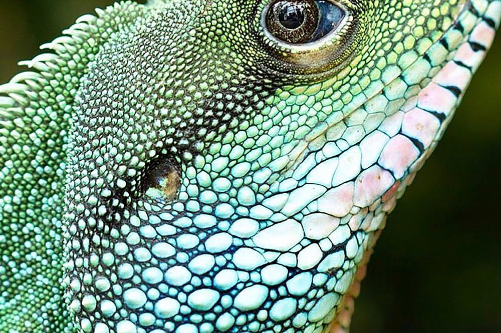 Een foto van een Chinese Wateragame. Dit reptiel is gefotografeerd in de botanische tuinen Kew Gardens in Londen. Bokeh achtergrond. Groene en bruine kleuren.