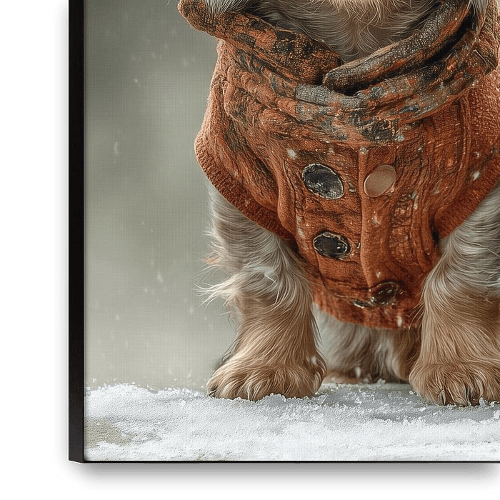 Portrait imaginaire de trois chiots teckels vêtus de manteaux d'hiver dans la neige.