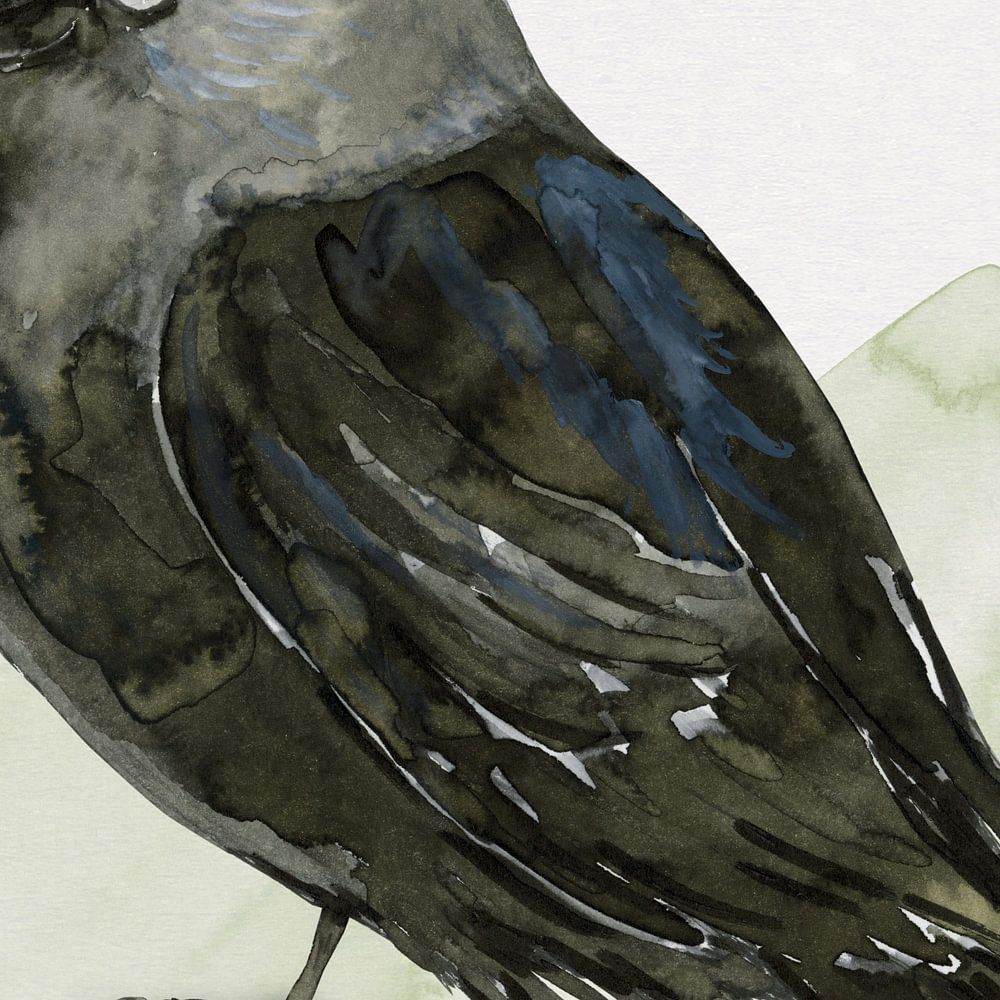 Un dessin à l'aquarelle d'un produit à Choucas des tours qui vous semble très doux. L'oiseau a l'air un peu timide.