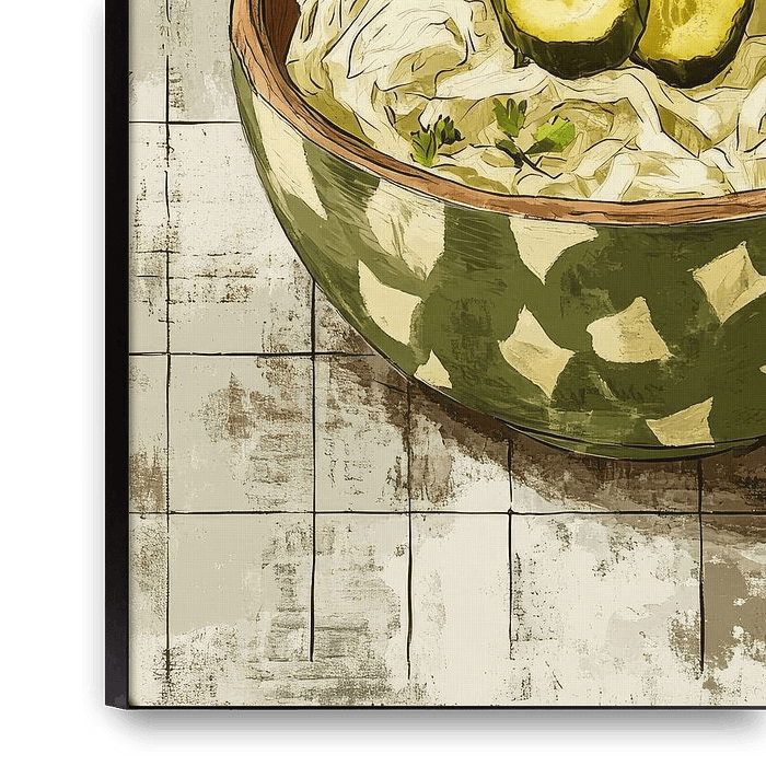 Cette illustration donne vie à une atmosphère rustique et vintage avec un bol dessiné à la main rempli de choucroute maison, agrémenté de tranches de cornichon et de persil. Le mur de carrelage usé en arrière-plan lui confère un charme nostalgique - parfait pour les cuisines ou les intérieurs campagnards.