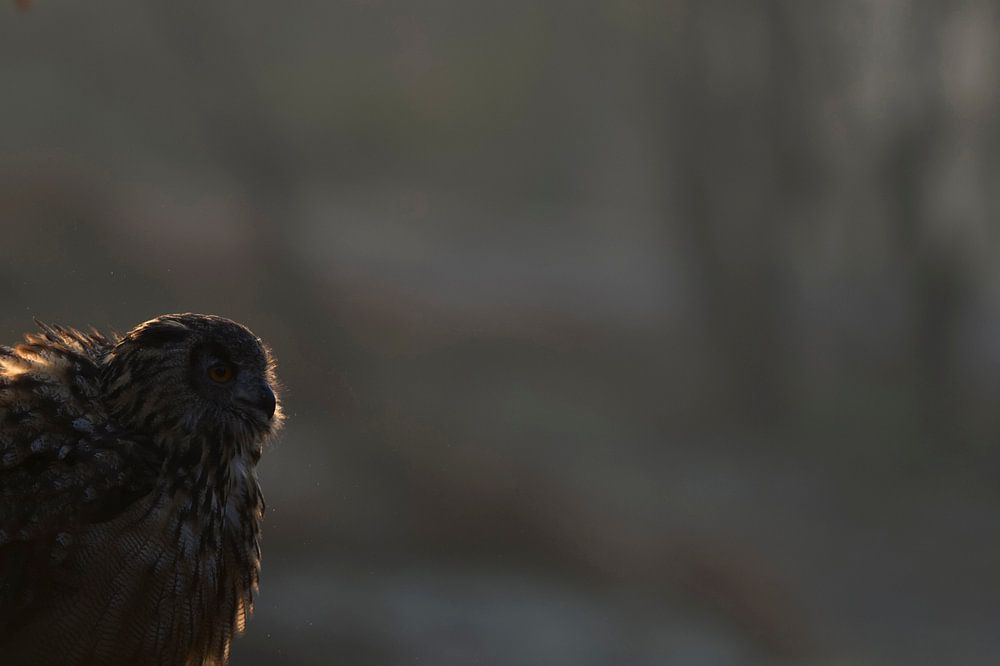 Chouette aigle ( Bubo bubo ) assise tôt le matin aux premières lueurs du jour, photo en contre-jour, belle couronne de lumière dans le plumage, légère, délicate, ambiance brumeuse, Europe.