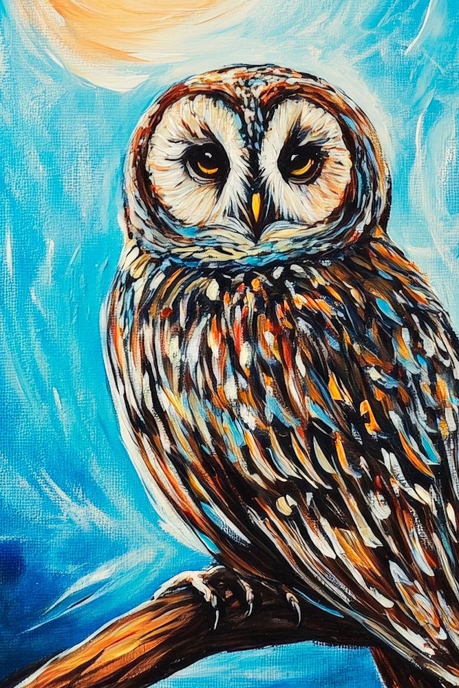 Avec ses grands yeux expressifs, la chouette regarde sereinement la nuit, entourée d'un fond bleu mystique et d'une lumière de lune éclatante. Cette combinaison harmonieuse de nature et de fantaisie confère à chaque pièce une atmosphère apaisante et est particulièrement parfaite pour une chambre à coucher ou un salon confortable.