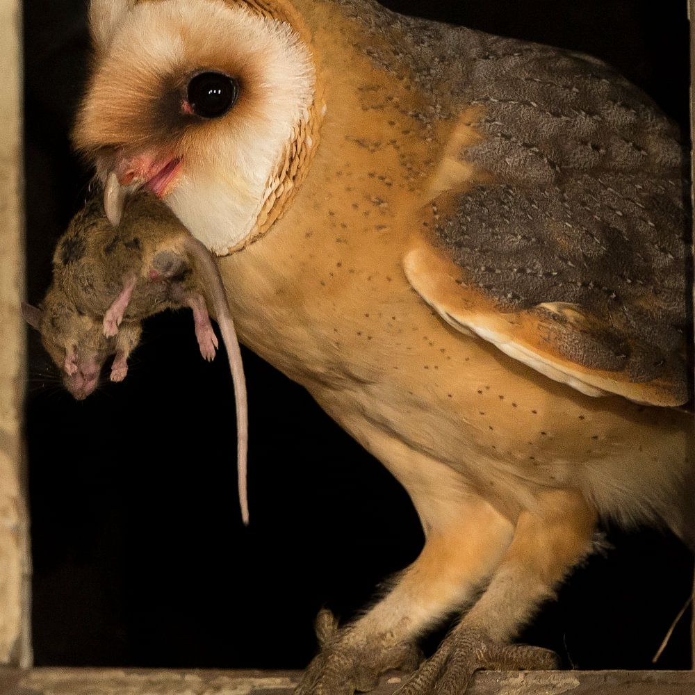 Deze kerkuil kwam uit een oude schuur waar een kapot raam in zit en heeft daar een lekker buit weten te vangen om deze aan de jongen te voeren