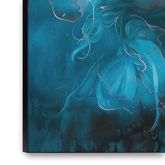Ethereal Whisper - Cette peinture surréaliste représente le visage d'une femme enveloppée par des fleurs vibrantes et éthérées dans une tempête de teintes bleues et roses.