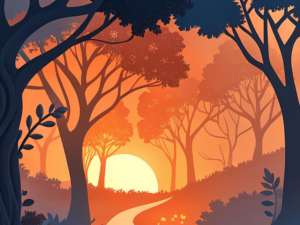 Alors que le soleil descend sous l'horizon, peignant le ciel dans des teintes chaudes d'orange et d'or, un sentier tranquille serpente à travers une forêt sereine. Des arbres silhouettés se dressent comme d'anciennes sentinelles, leurs branches complexes s'étirant vers la lumière déclinante. L'air est calme, rempli de la promesse du crépuscule et du bruissement subtil des feuilles. Cette scène évoque un sentiment de paix et invite à la contemplation dans la beauté tranquille de l'étreinte de la nature.