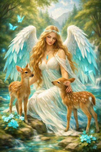 Entrez dans un monde d'amour, de douceur et de magie avec cette œuvre d'art Procreate faite à la main. Une deva aimante est assise au bord d'un ruisseau, entourée de deux petits cerfs. Sa robe et ses ailes blanches brillent de subtils accents bleu aqua, dégageant une impression d'harmonie et de tranquillité. Des papillons bleu aquatique…
