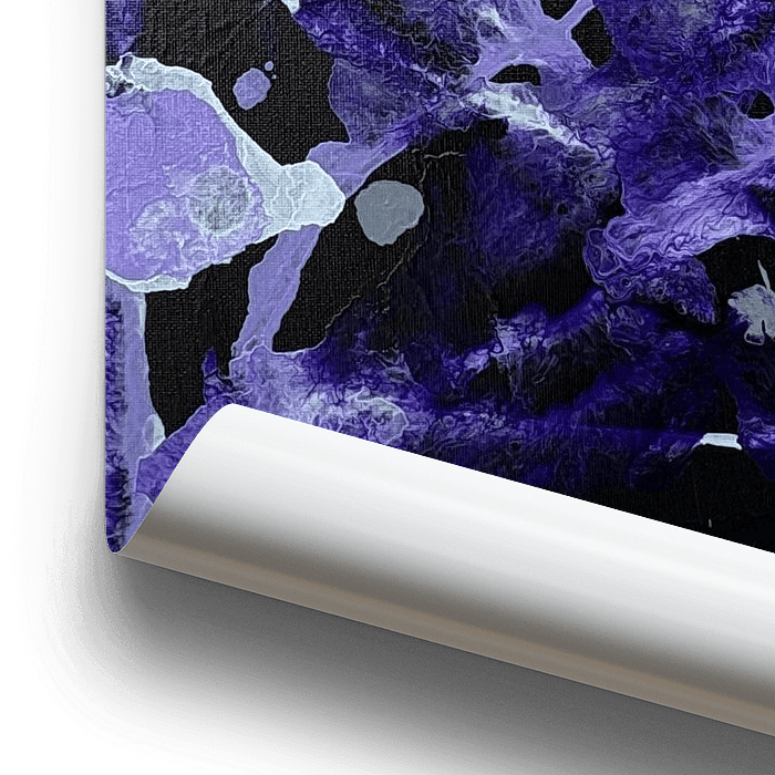 Un tableau abstrait puissant qui joue avec des tons violets et pourpres profonds sur un fond sombre. Des formes organiques traversées par des structures claires, presque flottantes, en lavande et blanc, évoquent des couches géologiques, une énergie fluide ou des paysages cosmiques.