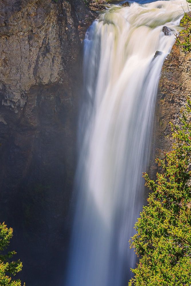 Photo verticale de Tower Falls, une chute d'eau sur Tower Creek dans la région nord-est du parc national de Yellowstone, dans l'État américain du Wyoming. À environ 1 000 mètres en amont du confluent du ruisseau avec la rivière Yellowstone, la cascade plonge de 132 pieds.