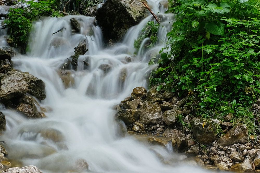 L'eau s'écoule dans les forêts d'Autriche, près du Gosausee. Nous sommes sur le chemin du Gosausee au Hinterer Gosausee, à environ une heure et demie de marche. En cours de route, nous rencontrons plusieurs beaux endroits comme celui-ci.