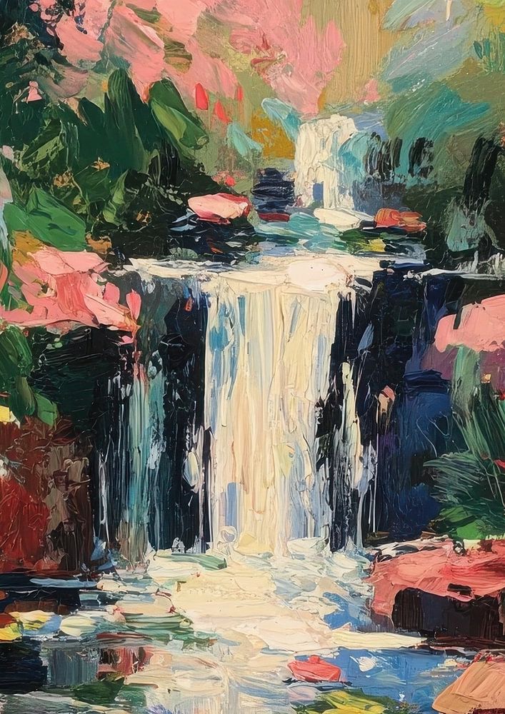 Cette peinture à l'huile représente une chute d'eau au loin, entourée d'une verdure luxuriante et de fleurs multicolores. L'eau se précipite dans un bassin cristallin qui reflète la lumière d'en haut. Des coups de pinceau puissants et épais et des couleurs vives dans les tons rose, bleu, rouge et jaune créent une atmosphère de rêve et d'harmonie. La composition combine des détails naturels, des accents floraux et le mouvement de l'eau, transmettant ainsi le calme, la vivacité et la beauté du paysage. La technique de peinture expressive souligne le dynamisme de l'eau et la fraîcheur de l'environnement tropical, créant une œuvre d'art colorée et inspirante, pleine de profondeur et d'énergie.