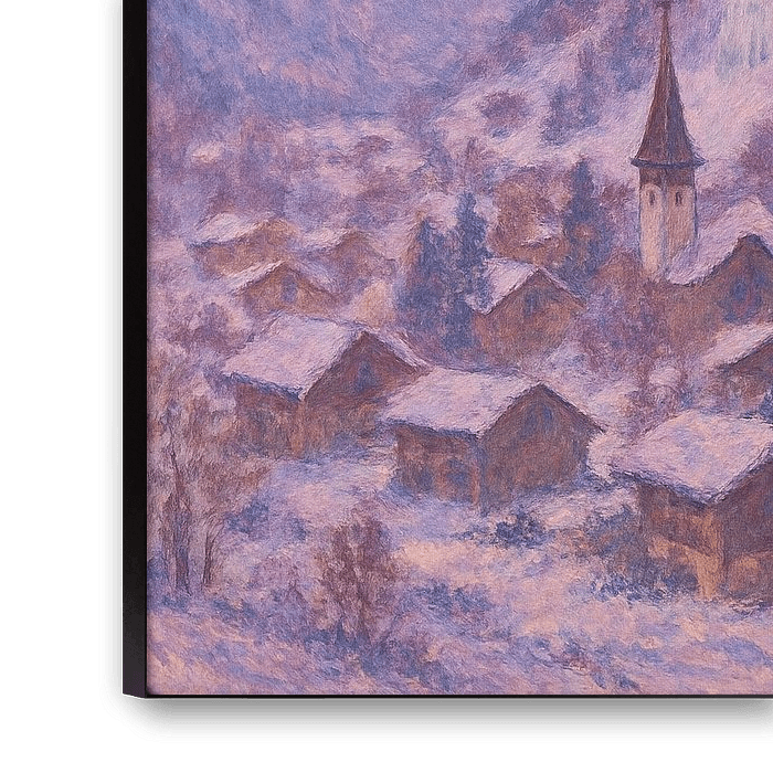 Une douce brume violette s'installe sur le village de Lauterbrunnen alors que le soir tombe. Une cascade d'un turquoise pâle descend des falaises, se détachant sur le ciel lavande et rose. La flèche de l'église s'élève doucement parmi les chalets enneigés, entourée d'un air qui semble presque bourdonner de lumière.