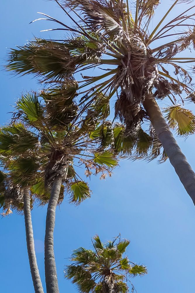 Vue d'été idyllique avec des palmiers sur fond de ciel bleu.