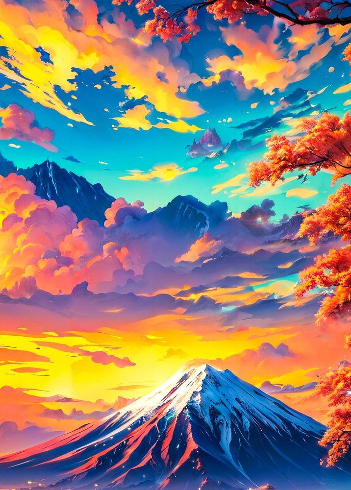 Un ciel nocturne cosmique brille au-dessus du mont Fuji et d'une ville japonaise tranquille, encadrée par des cerisiers en fleurs et des nuages vibrants au coucher du soleil. Cette œuvre d'art surréaliste allie la beauté terrestre à l'émerveillement cosmique. Le mont Fuji se dresse, enneigé et majestueux, tandis que les rues d'une ville japonaise brillent de mille feux. Au-dessus, le ciel est animé de nuages radieux, d'étoiles et d'une traînée lumineuse, tandis que des cerisiers en fleurs encadrent l'horizon. Un équilibre parfait entre tradition, nature et imagination onirique - idéal pour les amoureux du Japon, de l'observation des étoiles et des paysages vibrants.