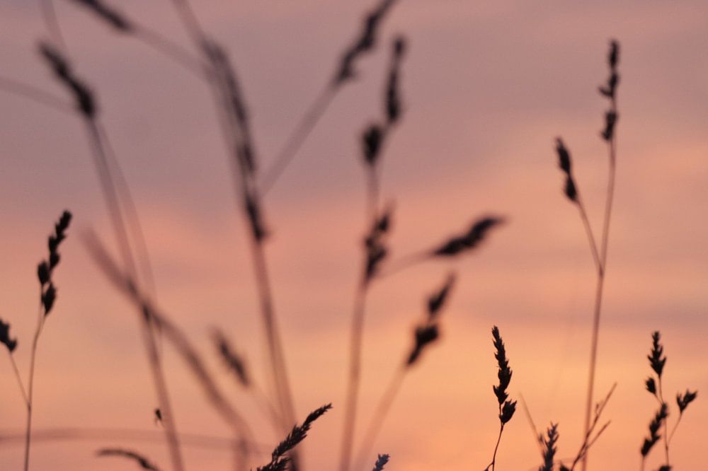 Photo de roseaux au coucher du soleil. Le ciel devient rose, orange et violet. Certains roseaux sont flous, ce qui donne de la profondeur à la photo. Belle photo chaleureuse pour le mur.