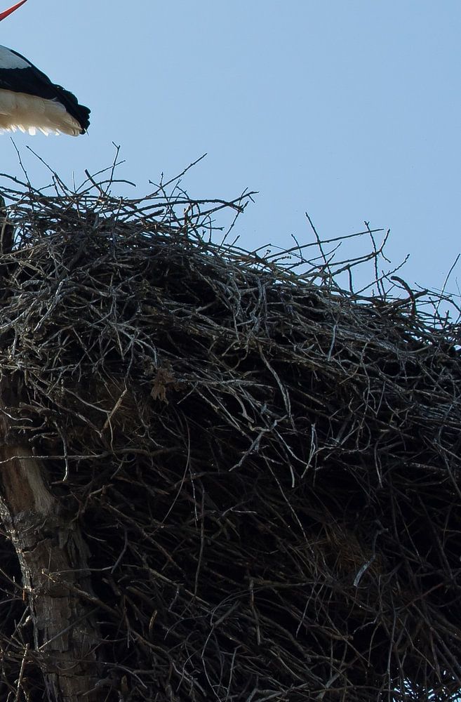 Cette cigogne est assise sur le nid naturel géant et bat des ailes. Elles le font en battant des ailes avec leur long bec, surtout au début du printemps, pour saluer une autre cigogne. Ils se reproduisent souvent sur des mâts spéciaux pour cigognes, mais ce couple se reproduit depuis des années sur cet énorme nid naturel situé le long du canal et d'une route importante.
