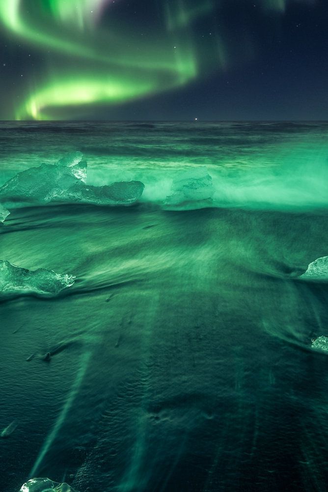 "Circe Poisoning the Sea" capture un paysage enchanteur d'une mer glacée sous une spectaculaire aurore boréale. Les lumières vertes et violettes serpentent dans le ciel nocturne, tandis que des morceaux de glace reposent sur la surface gelée de l'eau. Le mouvement dynamique des aurores boréales et la présence silencieuse de la glace créent une scène mystérieuse et surréaliste.