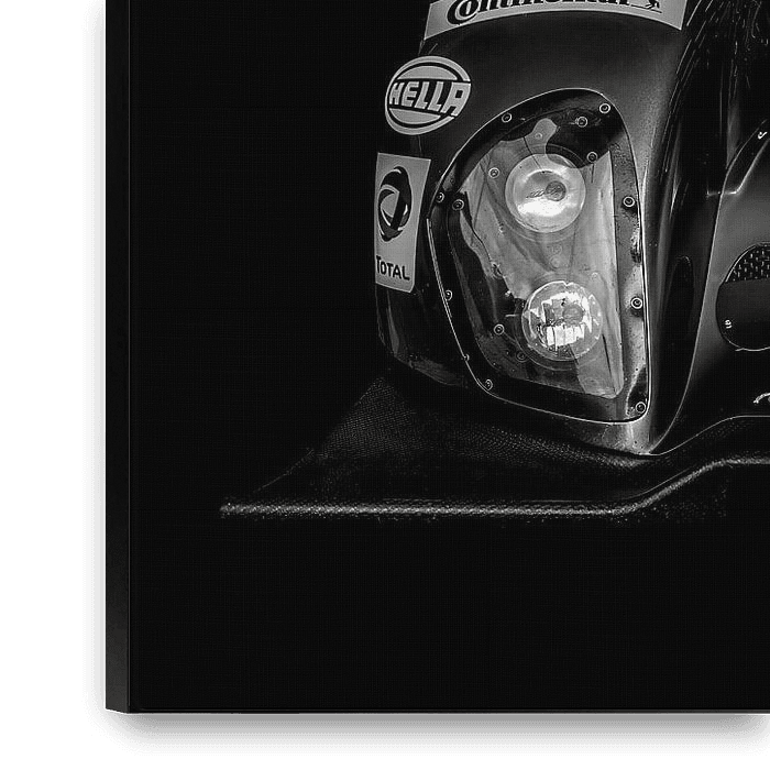 "Cette photographie atmosphérique en noir et blanc montre une impressionnante voiture de course LMP2 (Le Mans Prototype 2) à l'arrêt dans la voie des stands du légendaire circuit de Spa-Francorchamps. L'instant, capturé juste avant le départ, respire la concentration et l'excitation. Les détails des lignes…