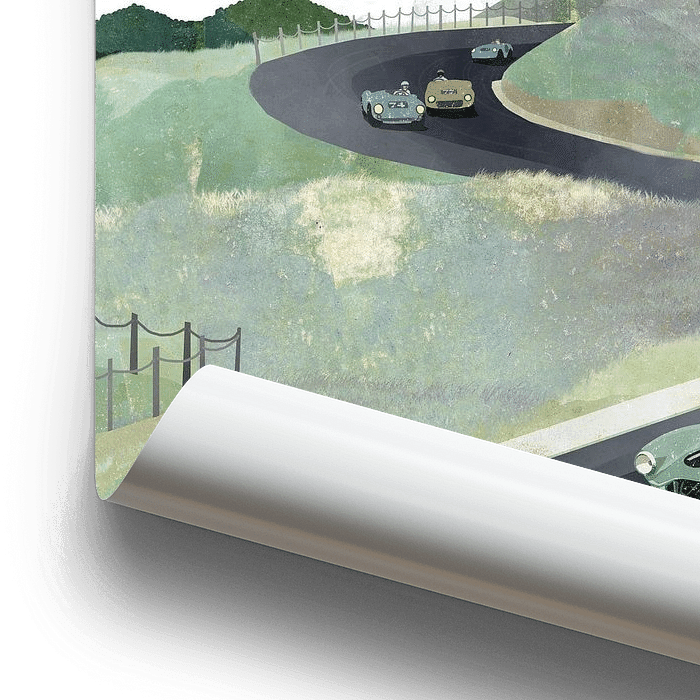 Illustration du circuit de Zandvoort entre les dunes, avec des voitures de course d'époque.