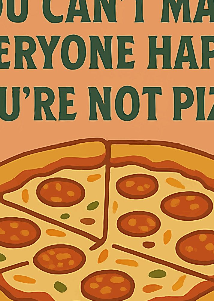 Un poster humoristique avec une illustration de pizza pepperoni et le texte "Vous ne pouvez pas rendre tout le monde heureux, vous n'êtes pas une pizza."Parfait pour les amateurs de pizzas, les fans de restauration rapide, la décoration de la cuisine, les snacks, et l'art mural amusant.