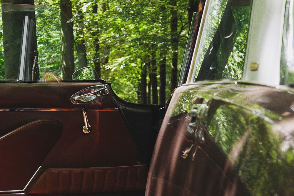 Enregistrement de l'arrière d'une DS 23 Pallas avec porte ouverte du côté du conducteur. La photo a été prise à la Bouvignelaan dans le Mastbos à Breda. Cette photo a un aspect rétro.