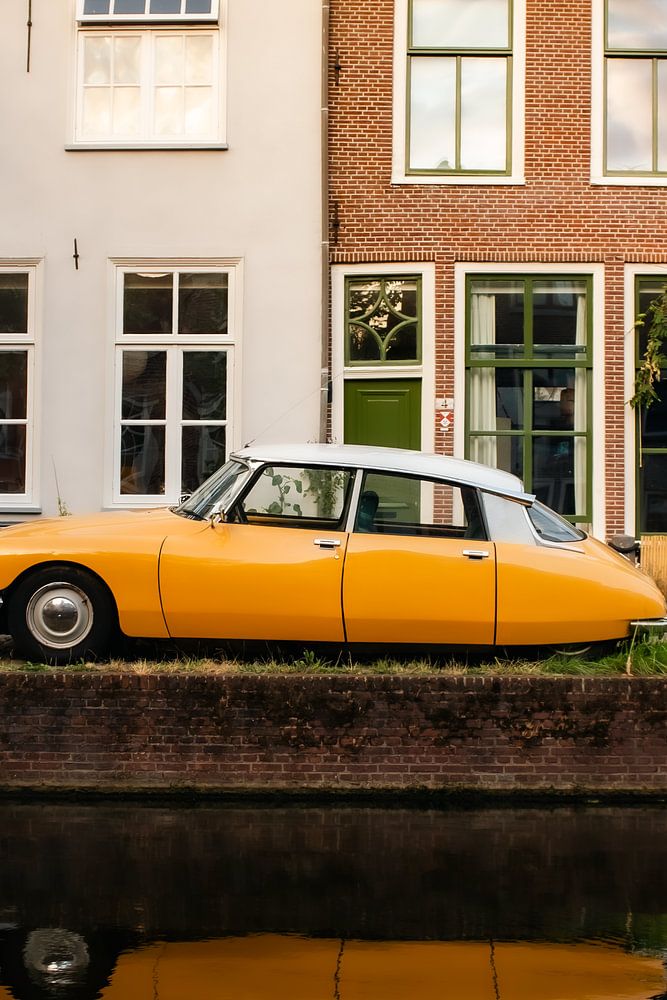 Cette photo atmosphérique montre une Citroën DS jaune ocre emblématique garée le long d'un canal néerlandais tranquille. Les lignes élégantes de la voiture classique se reflètent magnifiquement dans l'eau calme, créant une image presque pittoresque. La combinaison du design rétro, de la tranquillité urbaine et du reflet de l'eau rend cette photo unique et intemporelle.