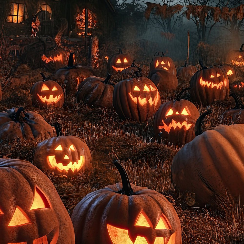 Cet arrière-plan brumeux ajoute de la profondeur et du mystère à la scène. L'impression que les citrouilles pourraient prendre vie ajoute une touche de suspense sans pour autant être écrasante. Le contraste entre l'obscurité menaçante de la nuit et la lueur chaude et vacillante des citrouilles rend cette image à la fois inquiétante et envoûtante. Cet équilibre magique permet à l'œuvre de se démarquer et de continuer à s'intégrer subtilement dans tout espace qui a besoin d'une touche d'excitation pour Halloween.