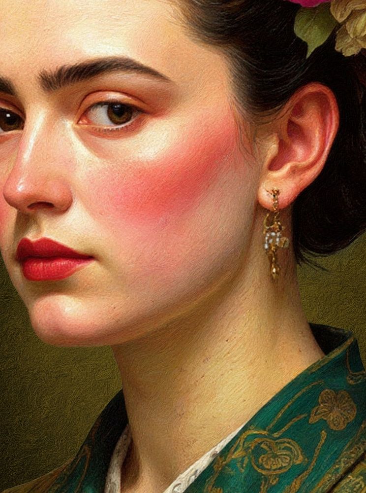 La femme porte un manteau vert olive avec un motif détaillé de couleur or, ce qui donne une impression de vintage et de texture riche. L'association du style classique du portrait et de l'aspect contemporain des fleurs fait de cette œuvre d'art un point focal parfait pour tout intérieur, qu'il soit moderne, classique ou bohème.