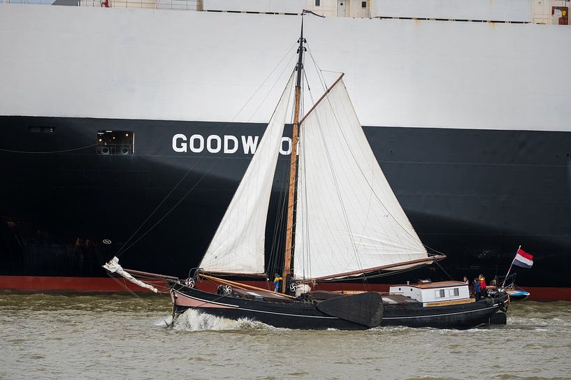Le Clipper The Joyful Arrival passe devant le car boat Goodwood à Emden, en Allemagne.