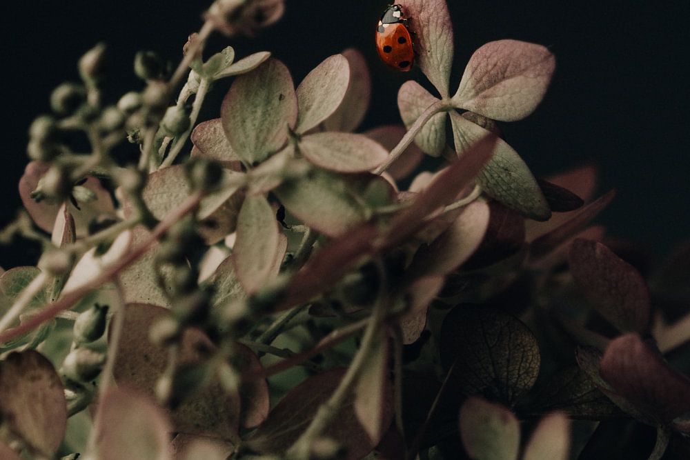 Fleur d'hortensia grise avec coccinelle, dans un style sombre à la mode, photo d'art, avec un éclairage subtil, gros plan de la fleur d'hortensia dans les tons de gris avec coccinelle en beaux points rouges et noirs