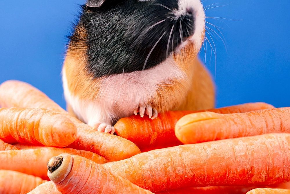 Un cochon d'Inde énergique est assis fièrement au sommet d'une pile de carottes orange vif, sur un fond bleu saisissant.