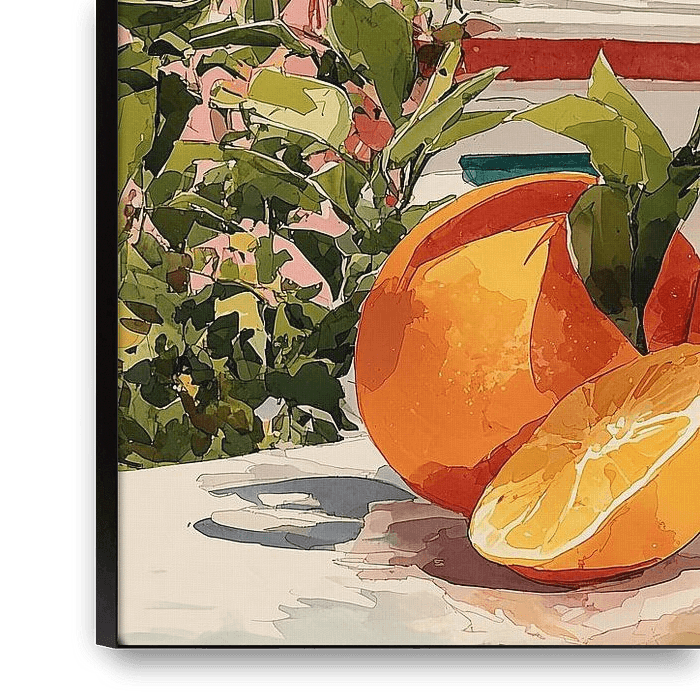 Une composition méditerranéenne ensoleillée où un cocktail d'orange rafraîchissant dans un élégant verre à vin occupe le devant de la scène, entouré d'oranges juteuses sur fond de façade rose caractéristique d'une villa de style méridional aux volets turquoise. L'association des agrumes mûrs sur l'arbre et sur la table, associée à…