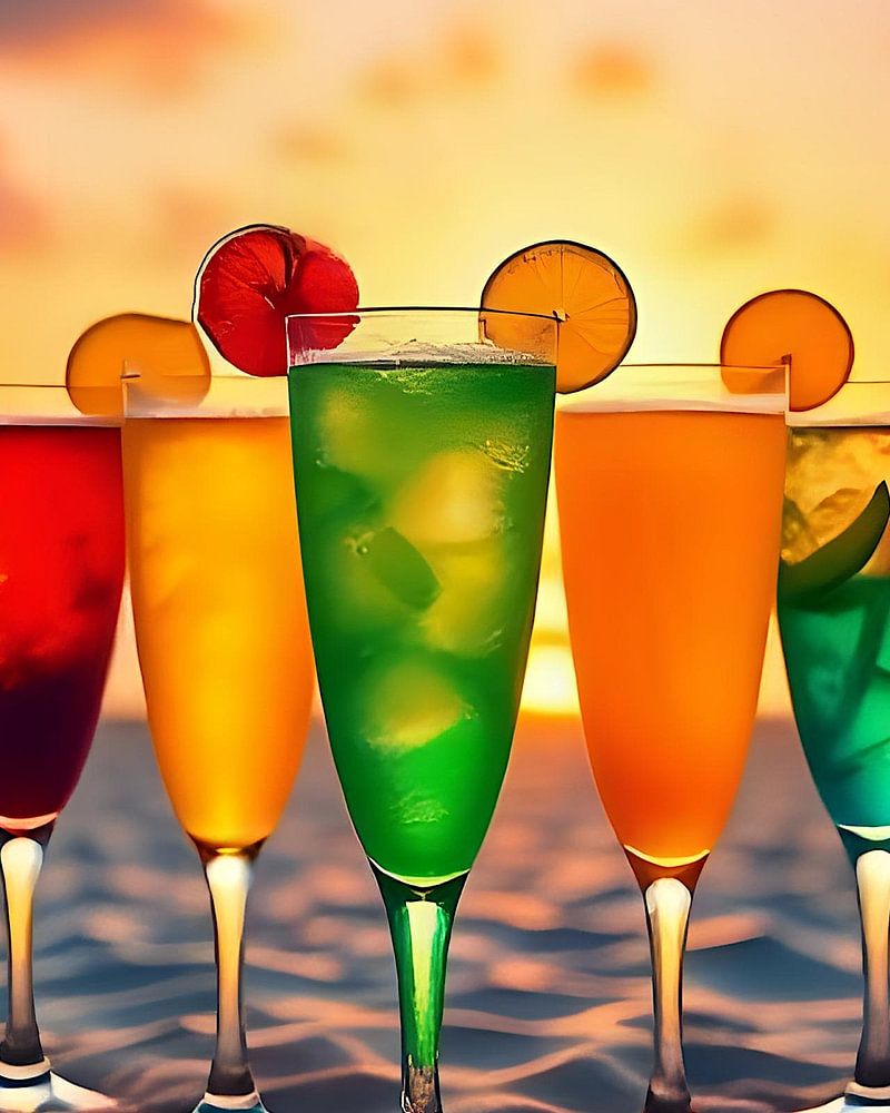 Cette composition dégage une ambiance joyeuse et insouciante, invitant le spectateur à un voyage dans le monde des plaisirs tropicaux. La combinaison des cocktails colorés, du sable doré et du pittoresque coucher de soleil crée une image harmonieuse de bonheur et de liberté - une invitation parfaite à laisser le quotidien derrière soi et à profiter de l'instant présent. Dans ce décor, le plaisir et la nature se fondent en une expérience inoubliable.