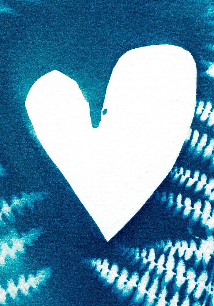 Un cœur blanc dans une nature sauvage de bleu et de fougères.