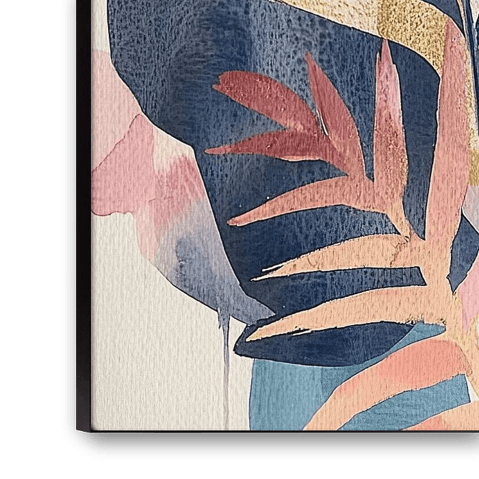 Petal Heart - Cette peinture florale présente une composition gracieuse d'une grande fleur rose avec un pétale en forme de cœur proéminent et plusieurs feuilles bleues et or rendues abstraitement sur un fond clair.