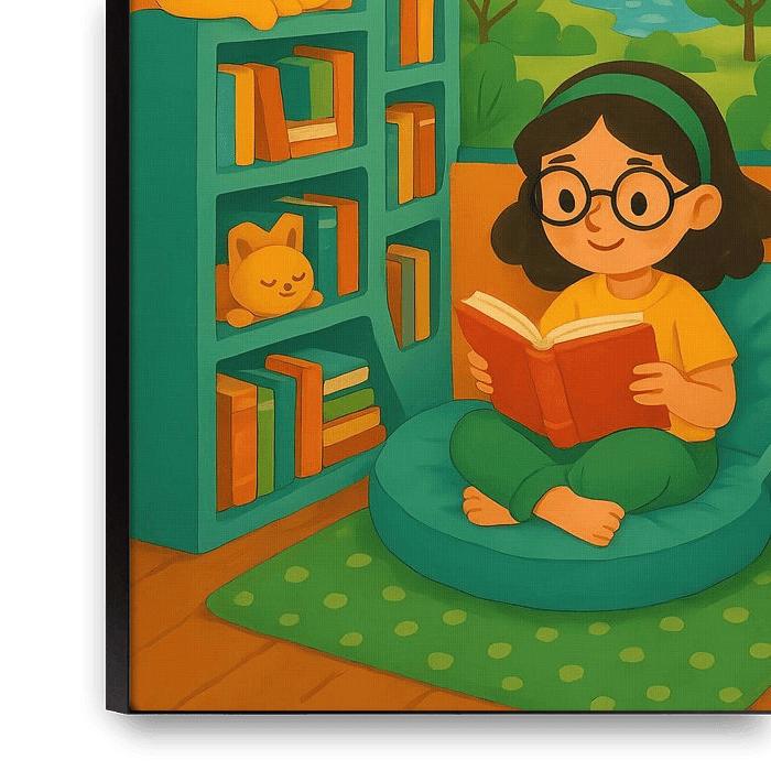 Illustration chaleureuse et charmante d'une jeune fille profitant d'un moment de lecture tranquille dans une pièce confortable remplie de livres. La scène présente un éclairage doux, des chats enjoués reposant sur des étagères et des plantes vertes luxuriantes qui ajoutent à la sérénité de l'environnement. À travers une grande fenêtre…
