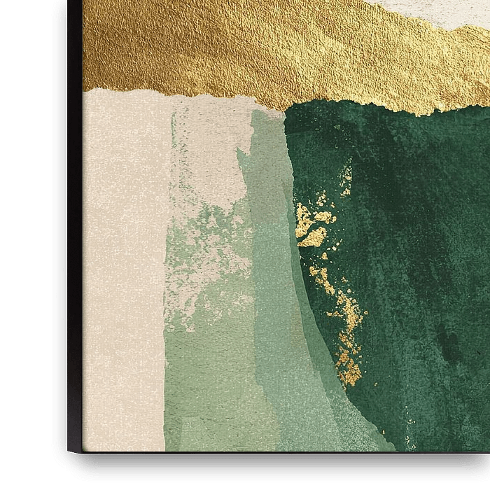 Cette composition abstraite associe des formes et des textures organiques dans une palette de couleurs harmonieuse composée d'un vert forêt profond, d'un beige doux et de touches dorées lumineuses. La structure en collage rappelle le papier déchiré fait main, superposé en plusieurs couches. Une bande dorée distinctive traverse la…