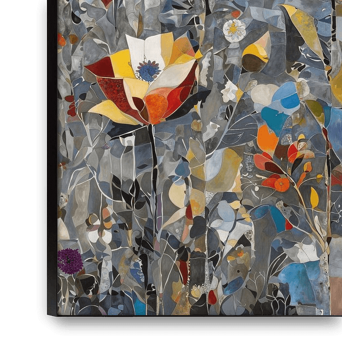 Collage abstrait de fleurs et de plantes colorées avec des arbres en arrière-plan dans des tons gris. Généré à l'aide de l'IA.