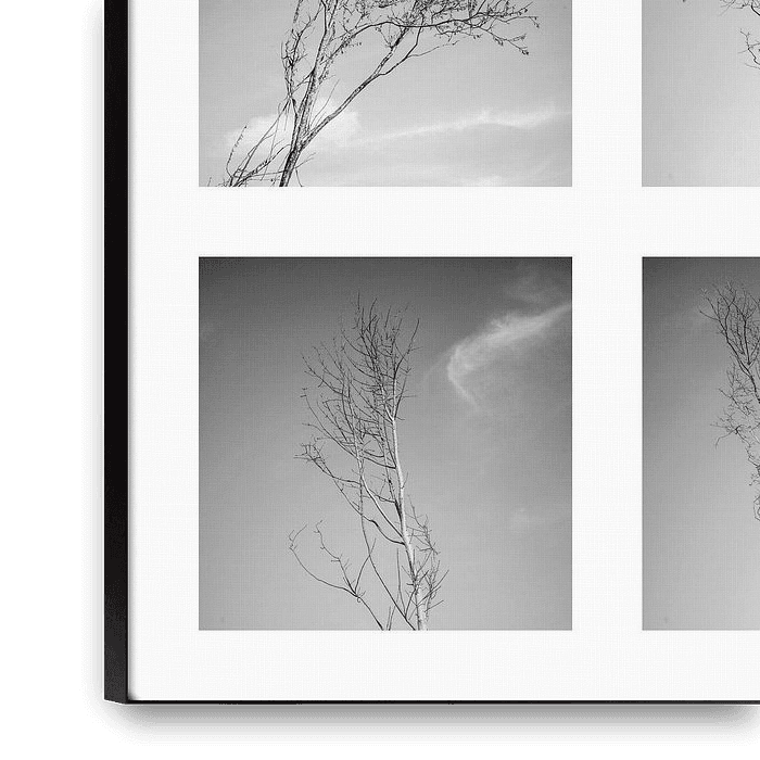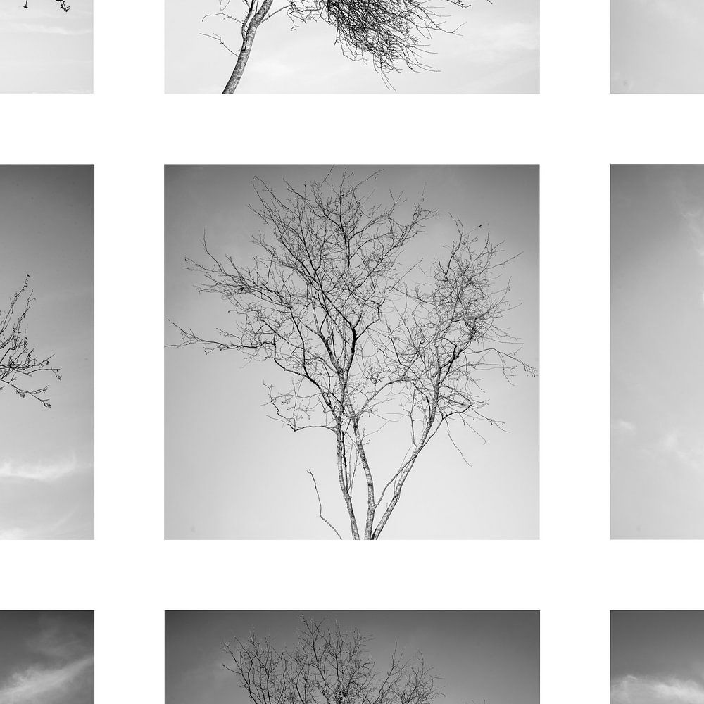 9 photos en noir et blanc sous forme de collage. Les arbres ont été photographiés en hiver afin de souligner l'effet graphique du vide et de l'apparence filigrane.