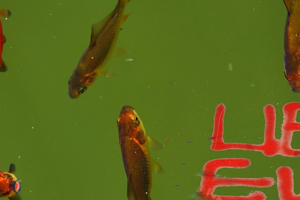 Photocollage d'une phrase en graphite avec un banc de poissons rouges dans un bassin de rétention des eaux de pluie