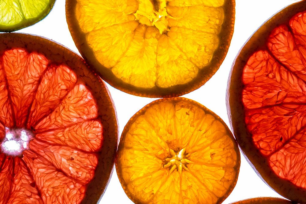 Collage de tranches de fruits sur fond blanc. Pamplemousse, orange, citron, lime et mandarine