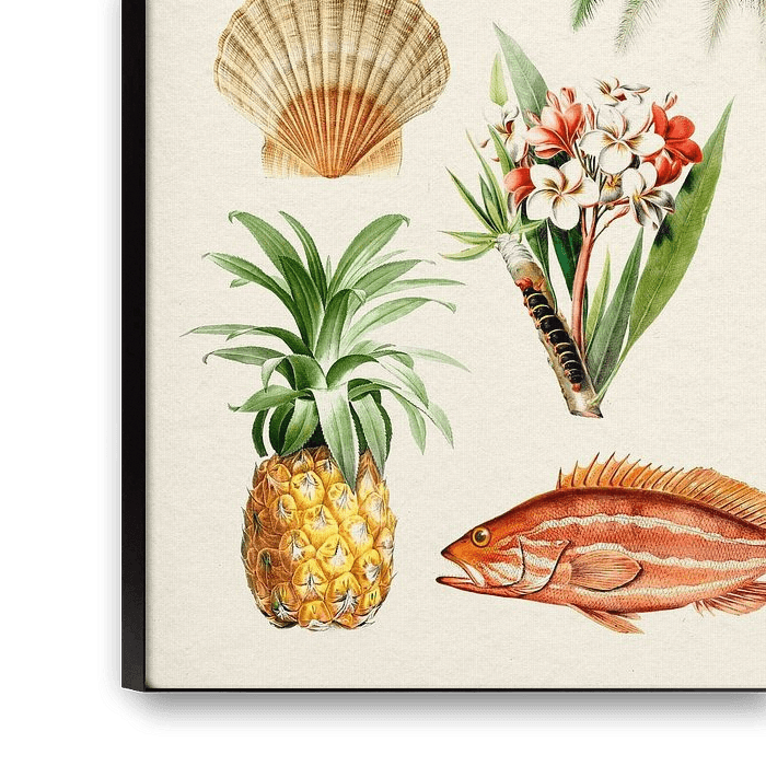 Cette œuvre d'art est une illustration de style vintage célébrant la beauté d'Hawaï. Elle présente une collection d'éléments tropicaux, dont un palmier, des fleurs exotiques, un ananas, une noix de coco, une tortue de mer, un perroquet et divers coquillages. Les tons doux et naturels et les dessins botaniques détaillés lui confèrent un caractère nostalgique et intemporel, capturant l'essence de la vie insulaire et de la nature hawaïenne.