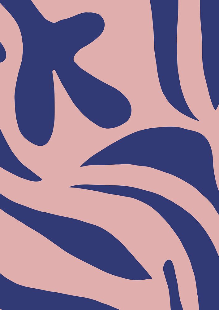 Une collection de différentes formes bleues dessinées à la main sur un fond rose. Cette œuvre abstraite est un bel ajout à votre intérieur.