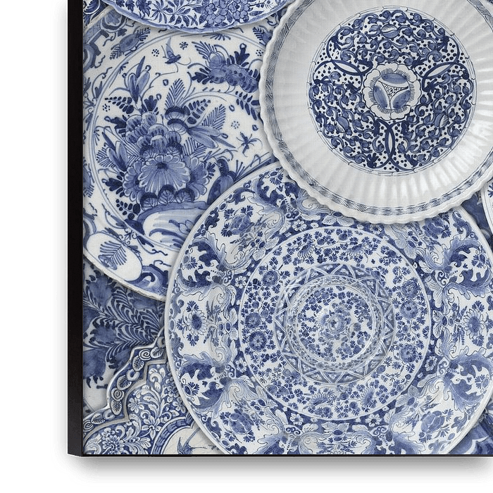 Cette œuvre d'art est composée de plusieurs pièces en bleu de Delft provenant du Rijksmuseum. Assiettes et plats des Pays-Bas et de Chine. Peint à la main, photographié et ensuite manipulé numériquement. Le mélange de bleus et de motifs donne un look moderne et peut être combiné avec d'autres pièces de cet album.